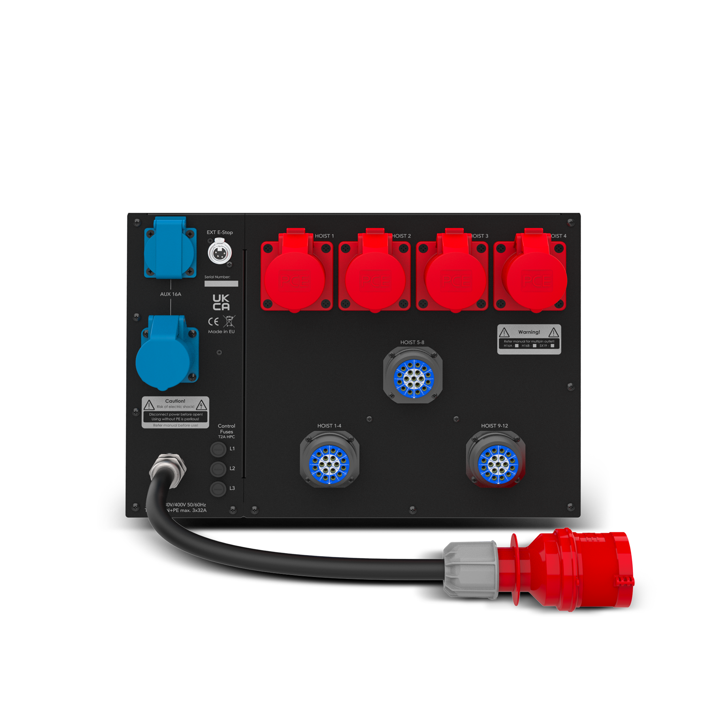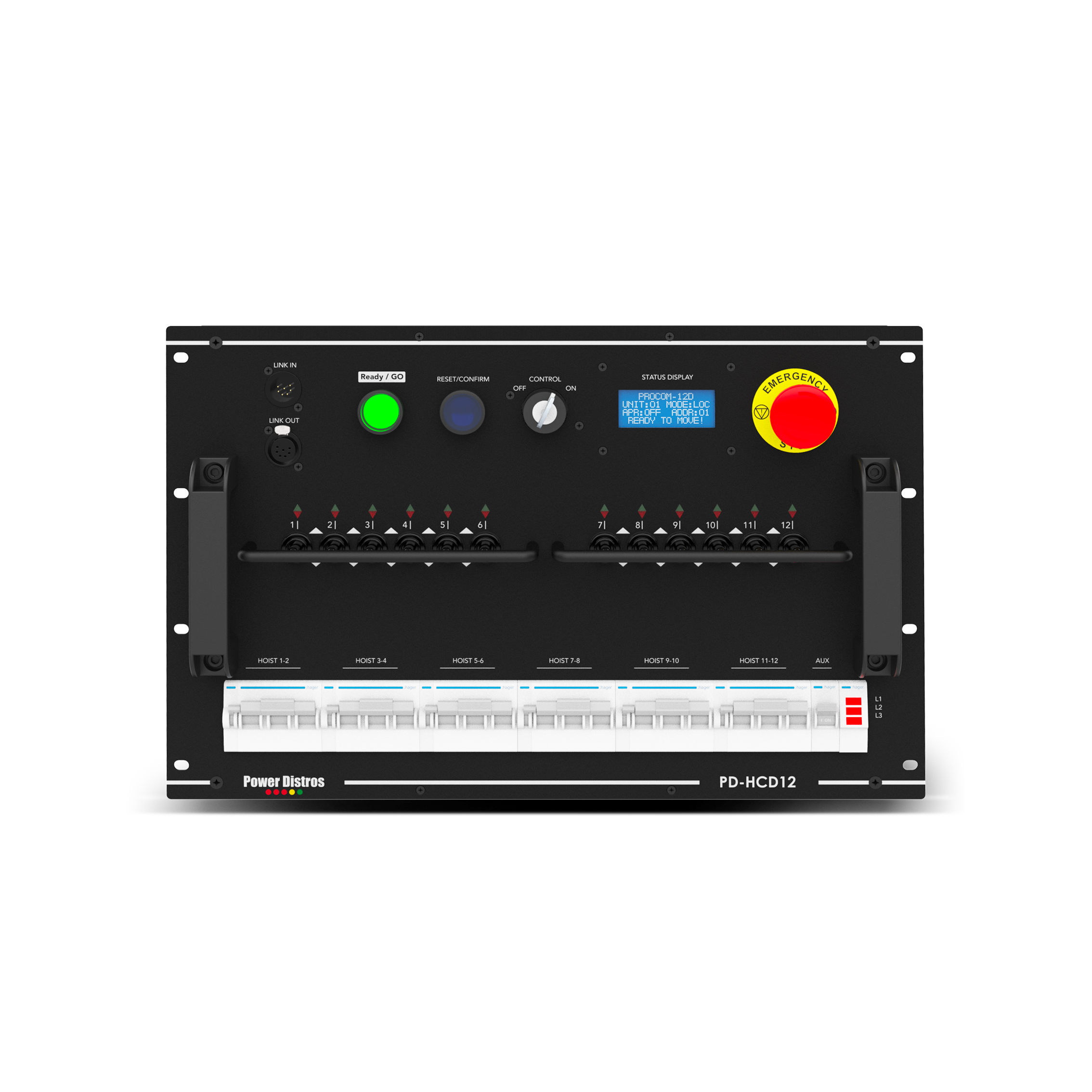 The PD-HCD12 is a professional, reliable 12-channel digital hoist controller featuring local direction control for precise motor management. It operates on 3x230V/400VAC power (3 x 32A) and uses 6 x 19-pole ‘Socapex’ connectors for output. Safety is ensured via forcibly guided relays and a 3P contactor system with 3P C10A protection per two motors. It includes XLR Link I/O and an External E-Stop input, delivering robust power and safety for complex staging and rigging setups.