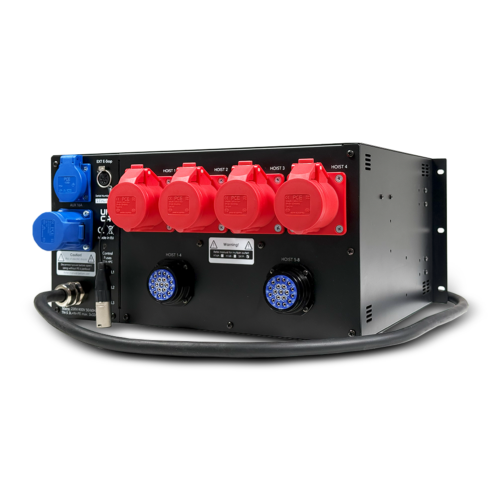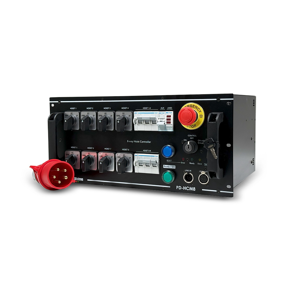 The PD-HCM8 is a professional 8-channel hoist controller providing reliable motor control with local direction control. It operates on a TN-S 3x230V/400VAC power supply and complies with Cat0 Stop function mode (EN60204-32) for high safety standards. Outputs are delivered via 4x or 8x CEE16/4P connectors. Output protection uses 3P C16A breakers for each 4-motor group. The controller features 7-pole XLR Link I/O for system linking and a 4-pole XLR for an External E-Stop signal, making it a robust and safety-conscious solution for rigging applications.